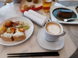 今回は結婚記念日の旅行でもあったのですが、事前に伝えていたところ、ラウンジでチョコレートケーキのプレゼントをいただきました。これが口どけ最高で絶品! さらに、スタッフの方に「ノンアルコールのカクテル」をお願いしたところ、ジャスミンティーベースのさっぱりしたオリジナルカクテルを作ってくださいました。 こういう温かいホスピタリティが、またここに来たくなる理由なんですよね。