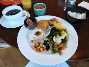 朝食は1階でブッフェ形式。 地元の郷土料理「明日香汁(あすかじる)」をはじめ、和食・洋食ともにラインナップが豊富。特に和食のクオリティが高く、朝から大満足でした。